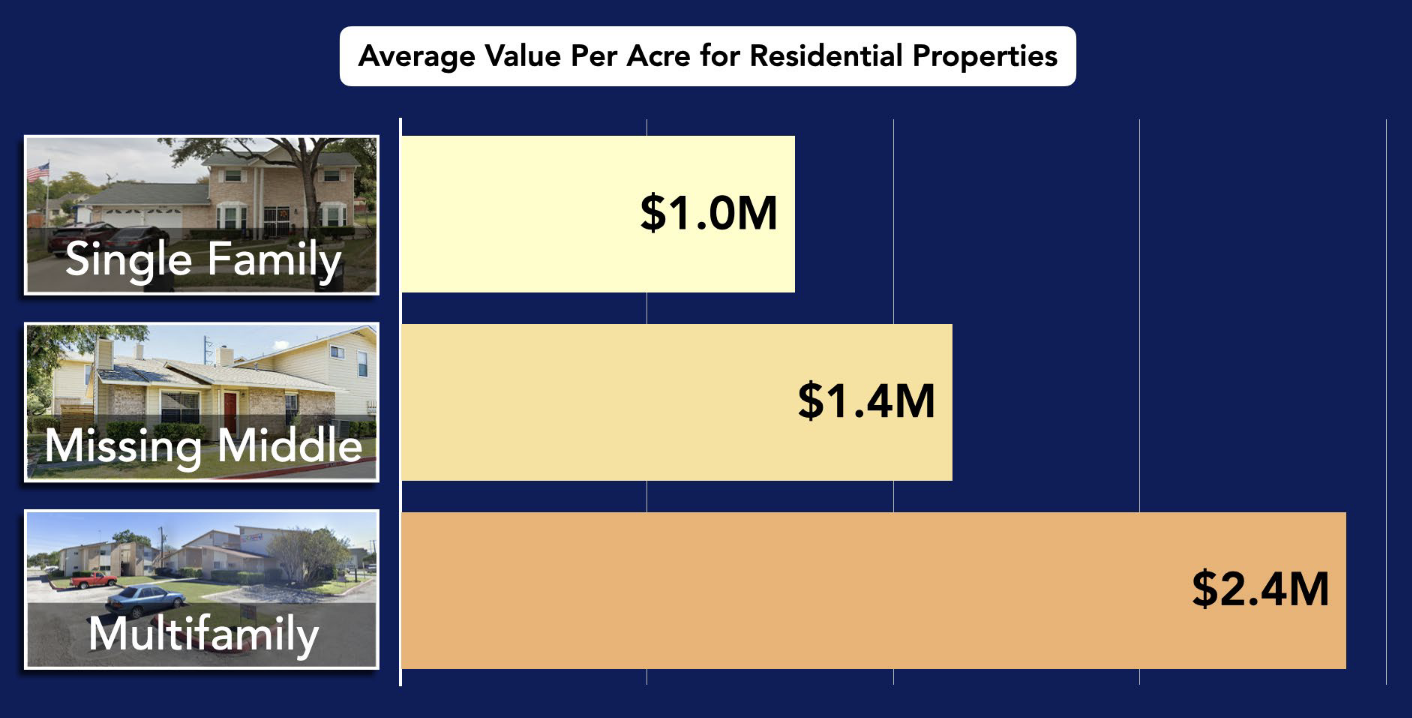 San Antonio’s land is not equally productive — and that has big consequences for the city’s financial health. Urban3’s analysis flips the script on how we typically measure value. Instead of simply looking at the total tax revenue from a property, they ask: how much value is produced per acre of land? When you consider land as a finite resource, this question becomes crucial. Just like we wouldn’t judge a car by how far it can go on one tank without knowing the size of the tank, we shouldn’t judge development by its total value without considering how much space it consumes.