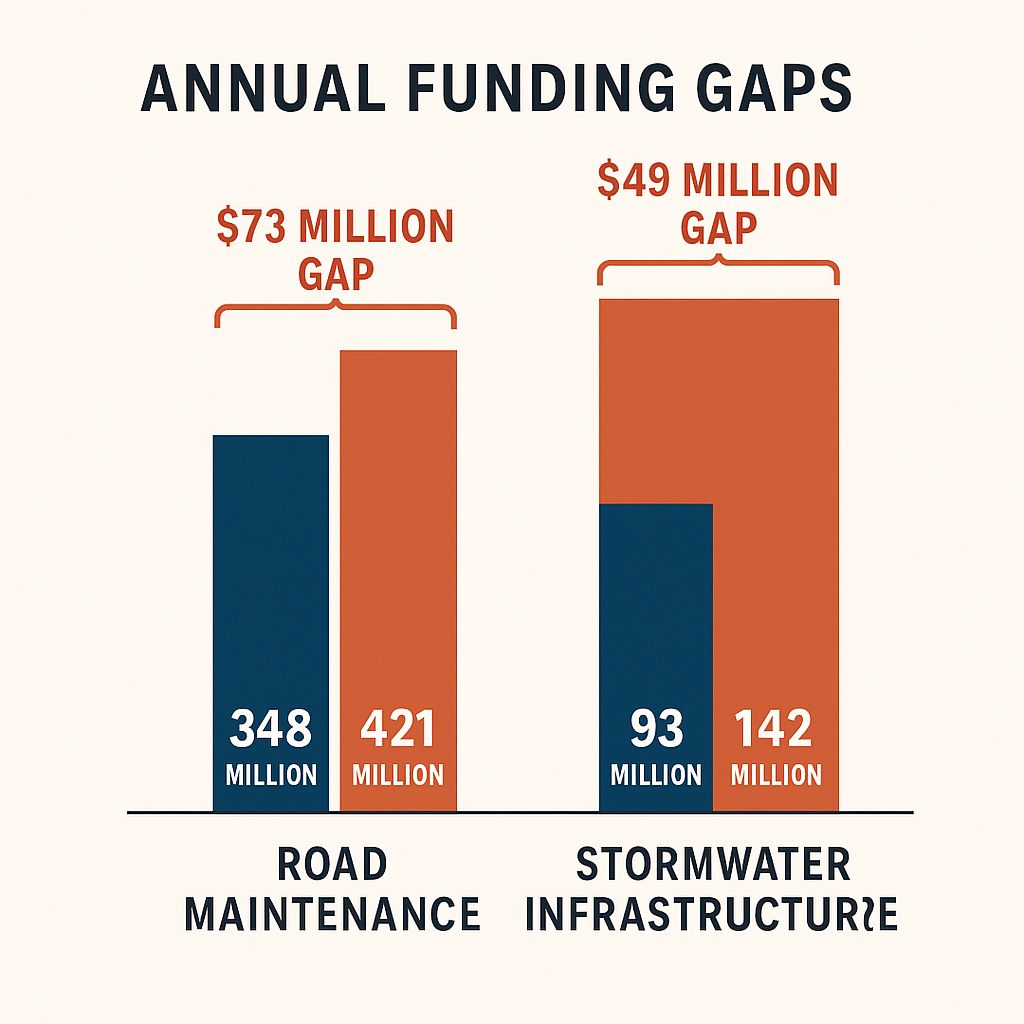 Urban3’s analysis highlights just how deep this funding gap runs. The city currently spends $348 million annually on road maintenance, but should be spending $421 million to keep up with the system’s lifecycle needs — a shortfall of $73 million every year. For stormwater infrastructure, the city spends $93 million annually, but Urban3 estimates we should be spending $142 million. That’s a $49 million gap. These aren’t abstract numbers — they represent deferred maintenance, worsening service, and greater future liabilities.